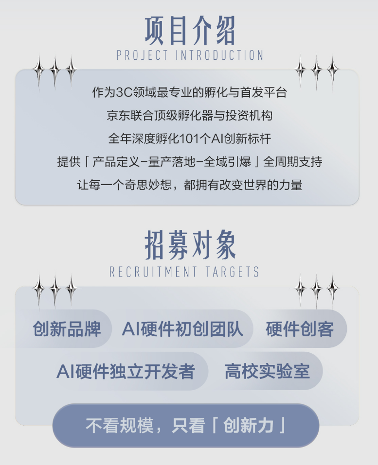 本次招募面向全球AI创新品牌、初创团队、硬件创客、独立开发者及高校科研实验室,申报项目没有企业规模或历史销售数据门槛,只看产品本身创新力与用户体验价值,凡具备明确技术路径与场景落地潜力的AI硬件项目均可参与。