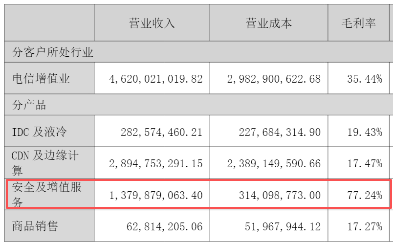 这一结构性改善的核心驱动力,来自高毛利业务占比的持续提升。其中,安全及增值服务已成为关键增长引擎。财报显示,2025年,该板块实现收入13.80亿元,同比增长18.65%,占总营收比重达29.61%;其毛利率高达77.24%,同比再增1.26个百分点。安全业务不仅具备极强的盈利属性,更与CDN、边缘计算等基础设施形成天然协同,构成公司“第二增长曲线”。