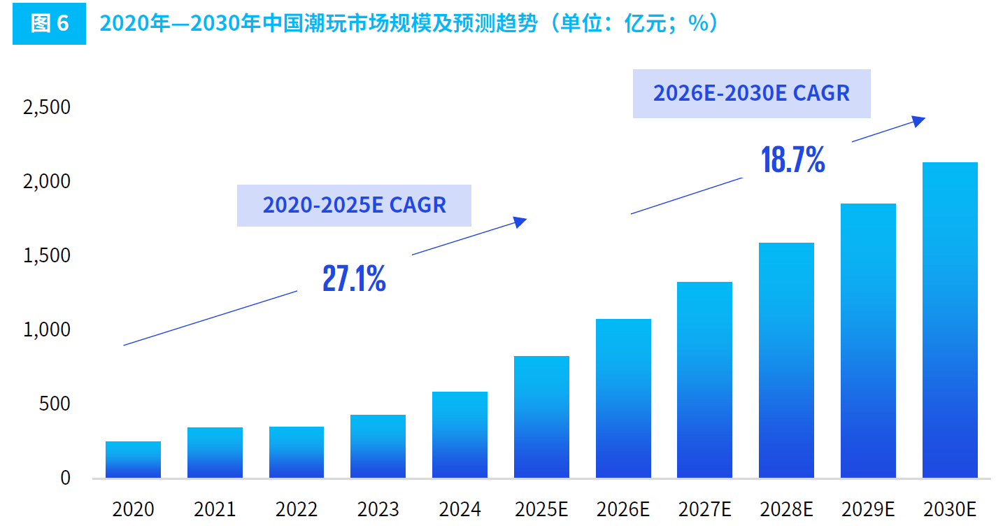 从全球来看,潮玩正持续从小众圈层走向大众市场。据国际知名会计师事务所毕马威2026年4月发布的调研报告《潮玩行业全景洞察与趋势展望》,2024年全球潮玩市场规模已达418亿美元,约合人民币2857.57亿元,同比增长14.2%,预计2025年将达520亿美元,约合人民币3554.88亿元;中国潮玩市场规模增速更快,2024年中国潮玩市场规模已达587亿元,预计2025年将达825亿元,2020-2025年CAGR(年均复合增长率)为27.1%,高于全球平均水平,预计2026-2030年CAGR为18.7% 。