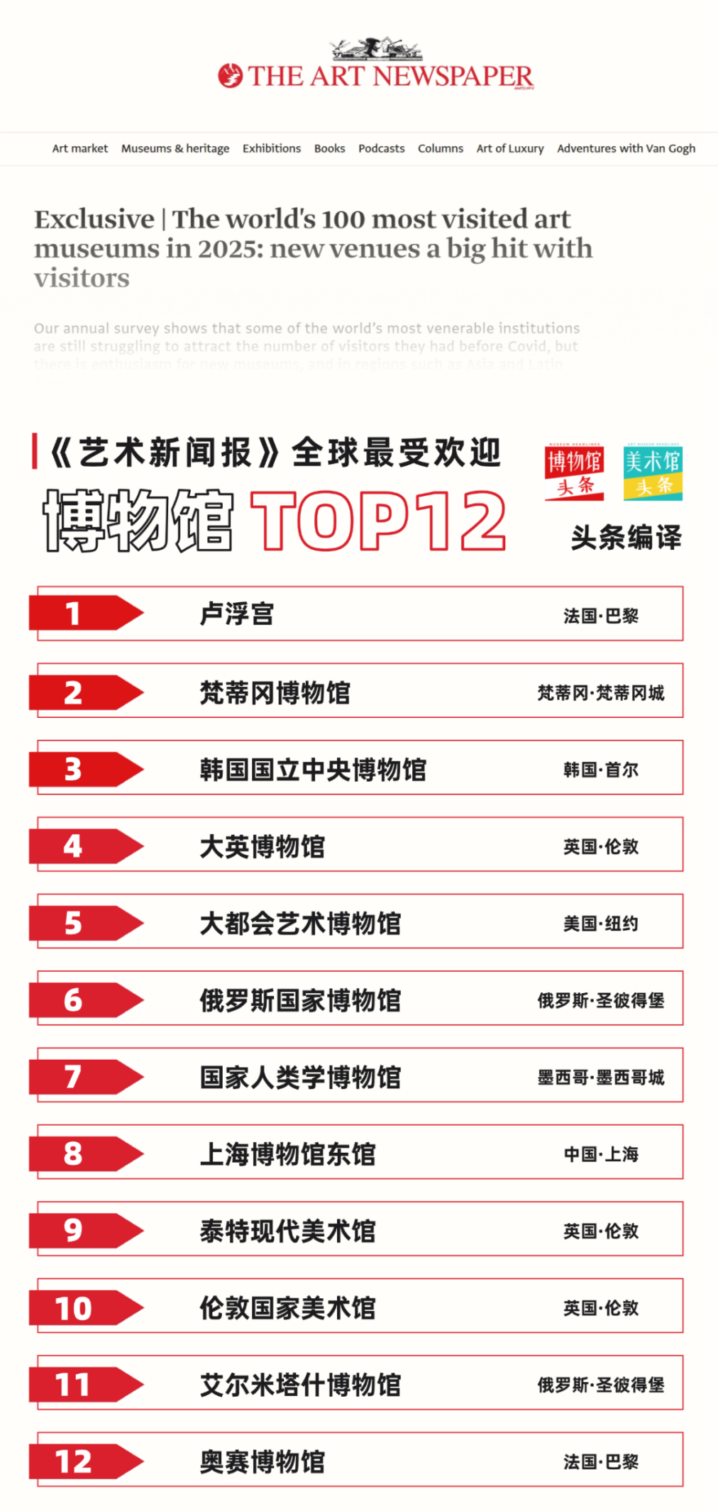 2025年全球博物馆参观研究年度调查报告显示,全球顶级博物馆、美术馆在2025年总访客量超过2亿,其中,卢浮宫、梵蒂冈博物馆、韩国国立中央博物馆位居前三,最受欢迎的top12博物馆中,国内仅上海博物馆东馆占据一席之地。
