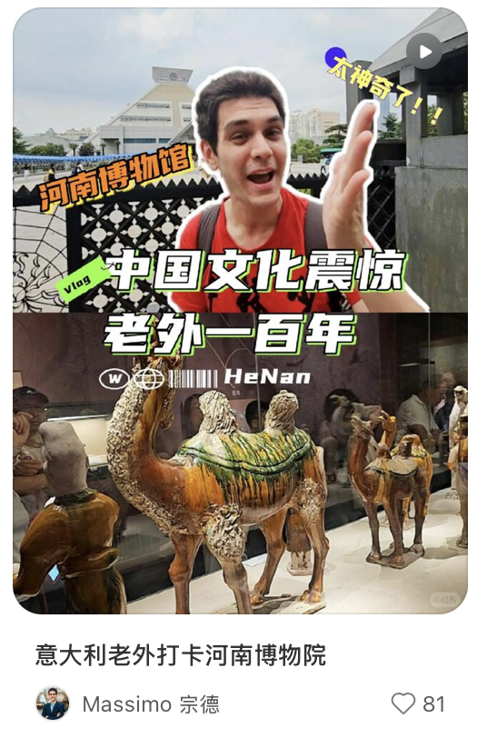 听完朋友的“博物馆奇遇”后不久,大数据就精准推送来一个外国友人“Massimo宗德”逛博物馆的视频——封面是“中国文化震惊老外一百年”,配的文案是意大利老外打卡河南博物院。