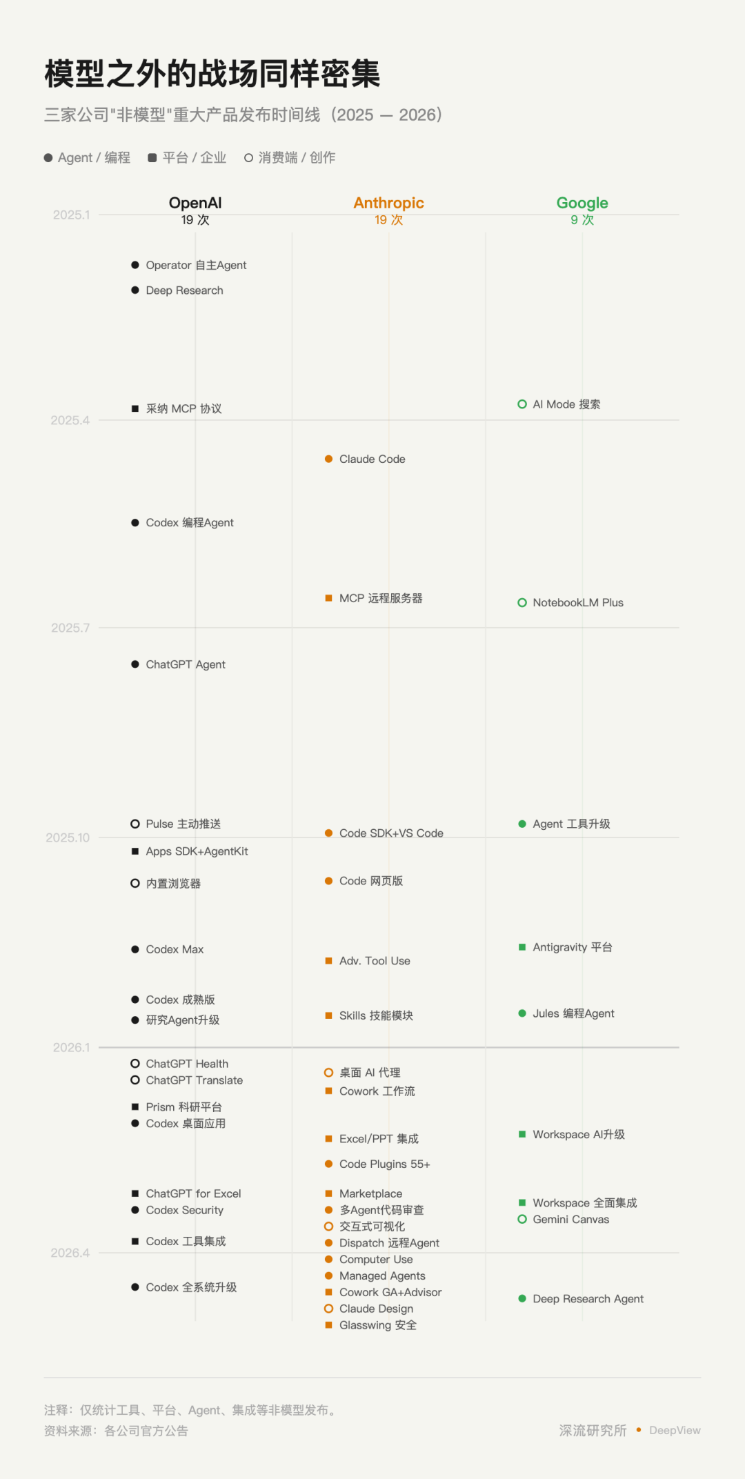 模型之外,产品战场同样战况激烈。过去一年多,仅 OpenAI、Anthropic 和 Google 三家,就完成了超过 40 次非模型级的重大产品发布。