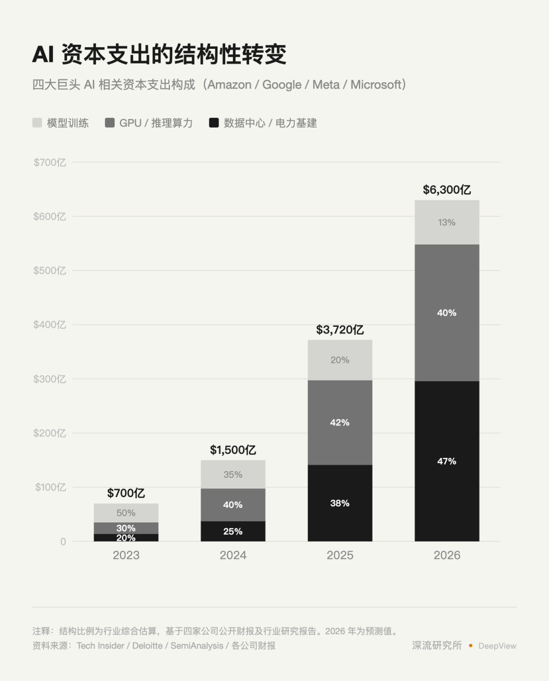 2026 年,仅 Amazon、Google、Meta 和 Microsoft 四家的 AI 资本支出,就预计达到 5870 亿至 6700 亿美元,接近 2025 年的两倍。真正值得注意的,不只是规模,而是钱花在了哪里。