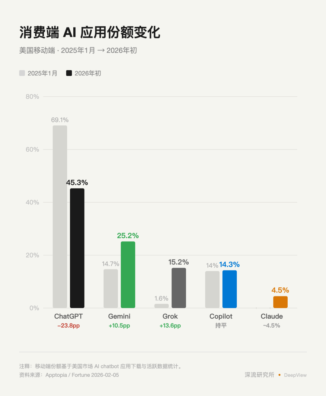 OpenAI 的变化更能说明问题。2025 年上半年,它还是不可动摇的王者:ChatGPT 周活达到 7 亿,移动端份额 69%。去年 8 月,GPT-5 发布失利成为转折点。直播出错、模型宕机,社区掀起"还我 GPT-4o"运动。此后,OpenAI 的移动端份额以月均 2.2 个百分点的速度下滑,到 2026 年初降至 45%。