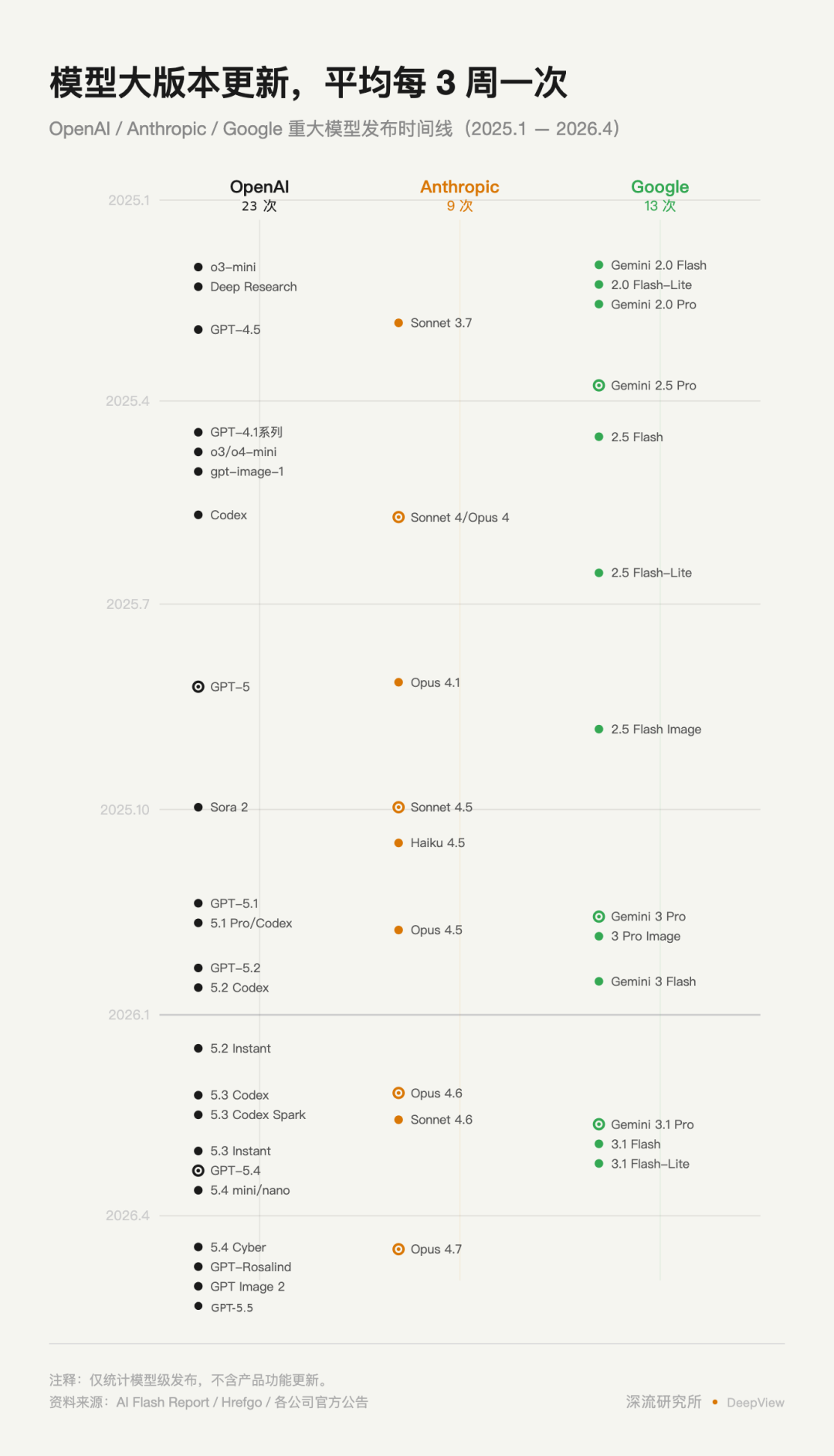 过去 16 个月,OpenAI、Anthropic 和 Google 合计完成了超过40次重大模型发布,平均每 3 周发布一次大版本模型。模型迭代从"攒大招",变成"小步快跑"。