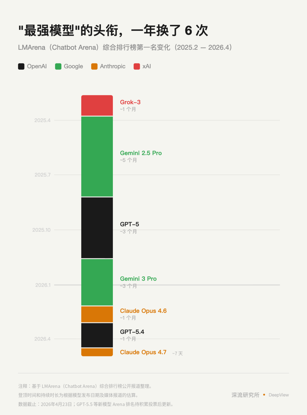 2025 年至今,LMArena 排行榜上"最强模型"的位置已至少换了 6 次。从 Grok、Gemini、GPT到Claude,四家轮流登顶。