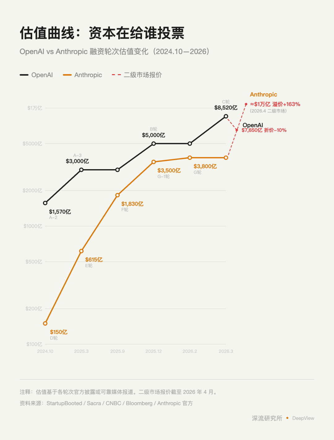 反观 Anthropic,估值从 2025 年 3 月的 615 亿美元飙升至 2026 年 2 月 G 轮的 3800 亿美元。更关键的是二级市场:投资者排队抢购,报价一度突破 1 万亿美元,较 G 轮溢价超过 160%,隐含估值已经反超 OpenAI。