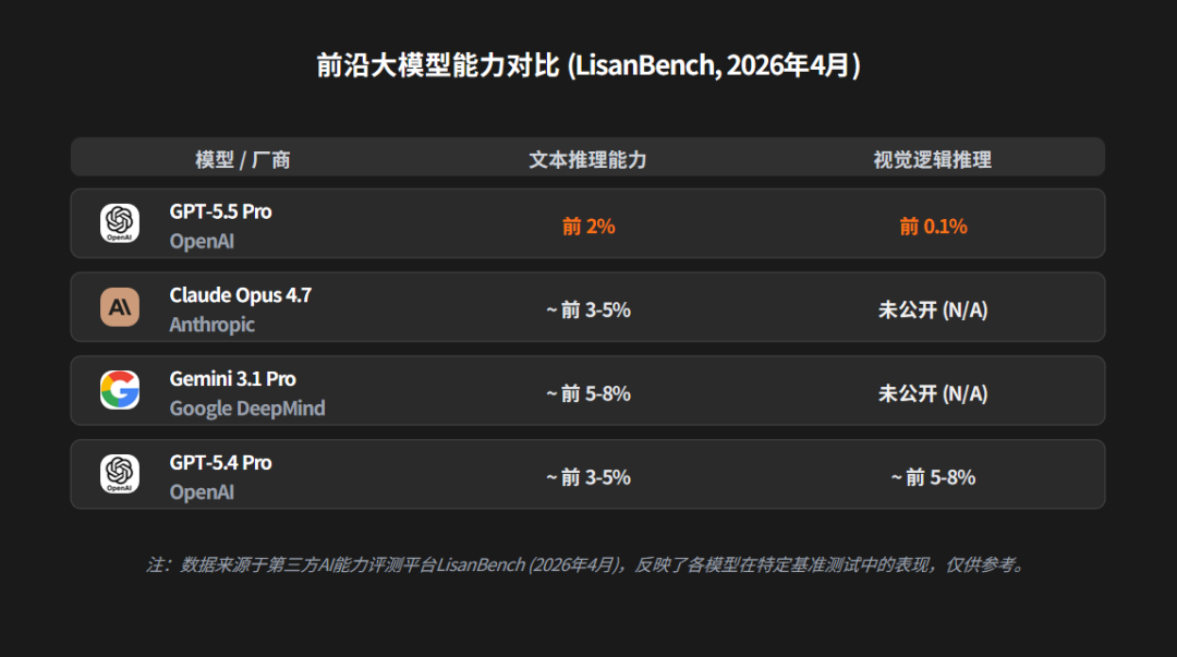 这意味着GPT-5.5 Pro在视觉逻辑推理上确实达到了人类顶尖水平,但在纯文本推理上,虽然也是聪明人,但并非天才。两者的差距是前0.1% vs 前2%。
