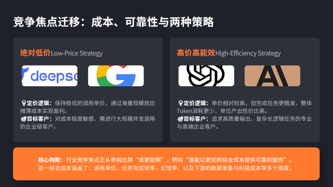 核心判断:竞争焦点正在从谁更聪明转向谁能以更优的综合成本提供可靠的服务——包括单价、效率、幻觉率、数据准备成本等多个维度。