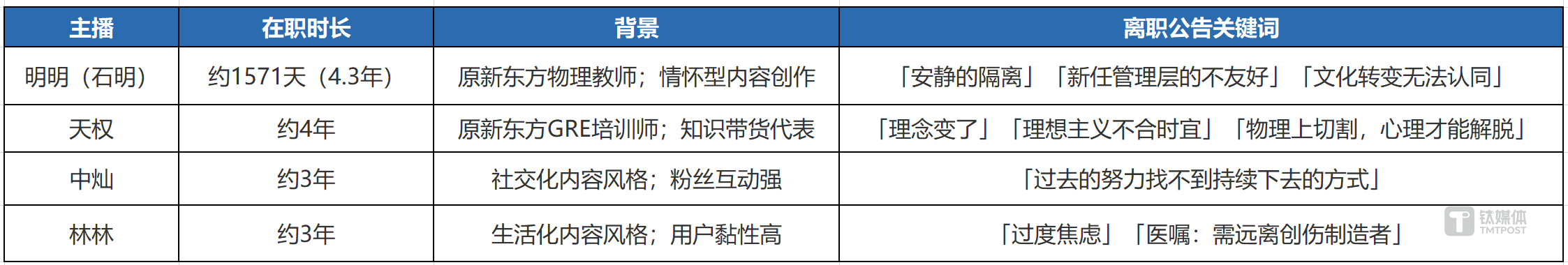 表2:四位离职主播基本信息与离职口径 | 数据来源:主播本人社交媒体公告(2026年4月24-25日)