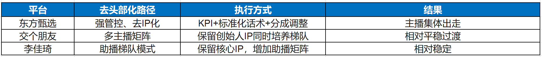 表4:主要直播机构「去头部化」路径对比 | 信息来源:各平台公开信息、媒体报道