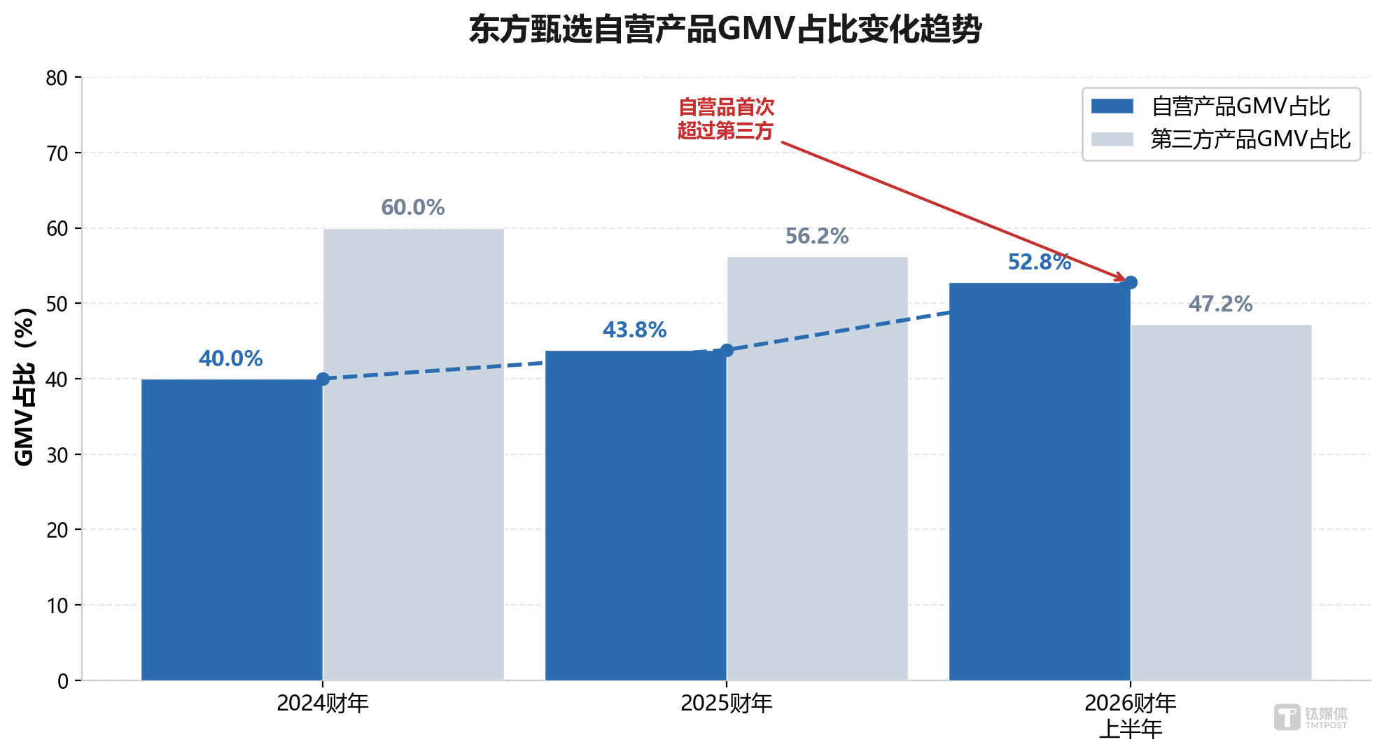到2026财年上半年(统计截至2025年11月),自营产品GMV占比攀升至52.8%,首次反超第三方货品。俞敏洪将自营业务定义为平台「主要增长动力」,也标志着东方甄选在商业模式层面,完成了从依赖主播到依赖货品的阶段性转型。