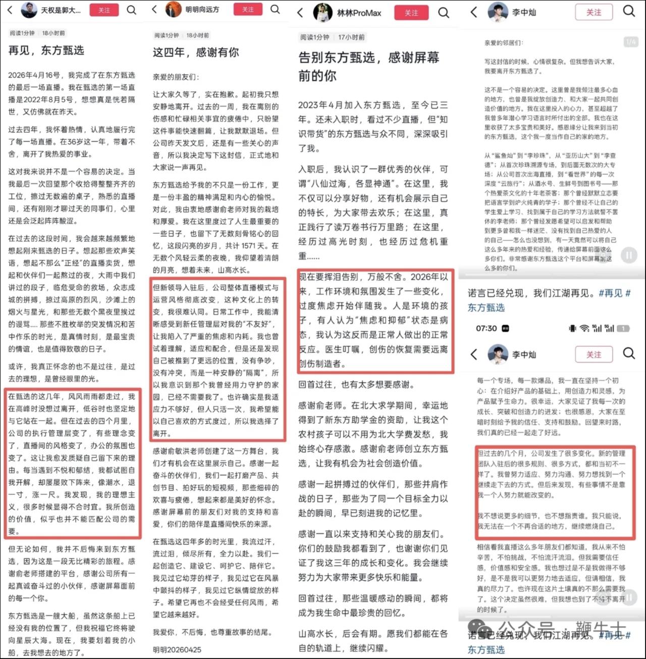 四人发文时间高度重合,且彼此点赞评论、相互呼应,形成了事实上的集体发声效果,舆论影响力远大于单人出走。而且四人声明都刻意弱化薪资、待遇等现实诉求,不约而同聚焦理想主义、情怀初心、管理氛围的冲突。这套叙事,精准击中东方甄选起家时最珍贵的品牌资产——最初的用户留下来,从来不是为了低价好物,而是为了这群有温度、有学识、有真诚感的主播。