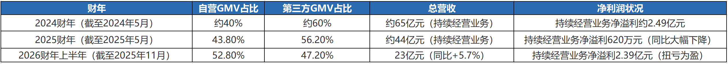 注:①「净利润状况」均为持续经营业务(自营产品及直播电商)口径。②2024财年自营GMV占比为根据财报披露的2025财年同比增幅推算的近似值。③2025财年营收较2024财年下降约32.7%,主要因与辉同行于2024年7月分拆,以及教育业务不再纳入持续经营口径。