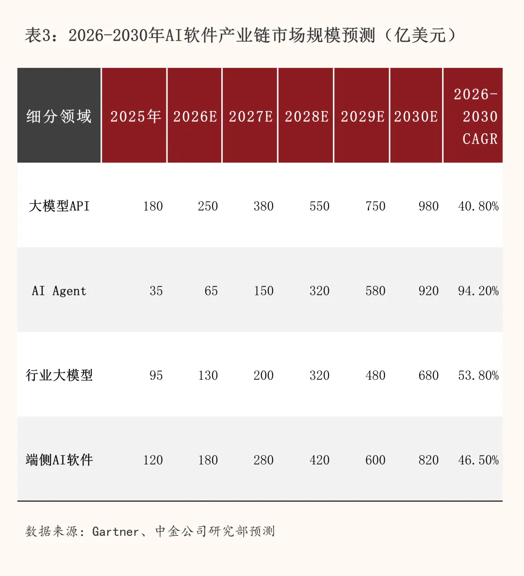 国泰君安认为“软件公司的出路在于‘垂直化+场景化’,通用大模型已成红海,但金融、医疗等垂直领域仍有10倍空间。”野村证券也称:“AI Agent是2026年最值得关注的软件方向,我们预计2027年Agent市场规模将达150亿美元,复合增速120%。”