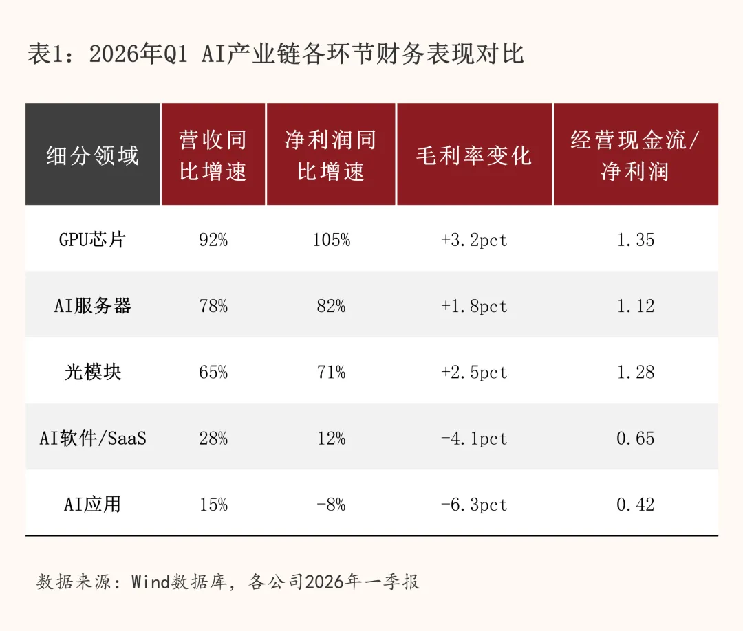 首先,纯软件及AI应用公司的平均市盈率从2025年的65倍回落至2026年一季度的35倍,而GPU、服务器、光模块等AI硬件龙头的市盈率则维持在45-55倍的高位,且业绩持续超预期,估值分化加剧。