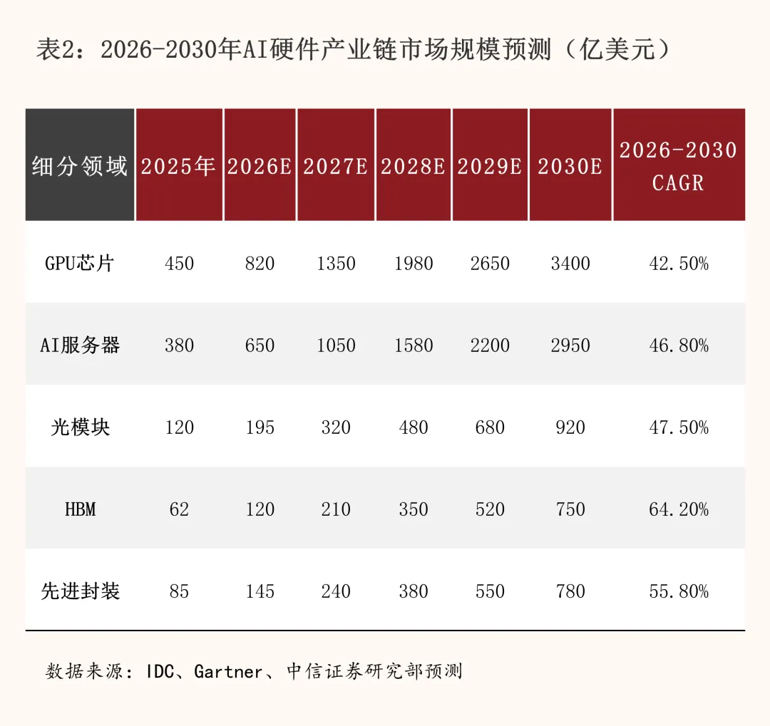流动性驱动退潮,盈利兑现成为唯一的“硬通货”。市场正从“市梦率”思维转向“市盈率”思维,投资者更加关注真实的订单、利润和现金流。硬件为王,GPU、服务器、光模块构成的“黄金三角”,2026-2030年净利润复合增速预计超过45%,供需失衡至少持续至2027年,订单可见度充足,毛利率持续提升。软件待时,短期应规避通用大模型,重点关注垂直领域和AI Agent的突破性进展;2027年后,随着商业化落地,软件板块有望迎来估值与业绩的双击。