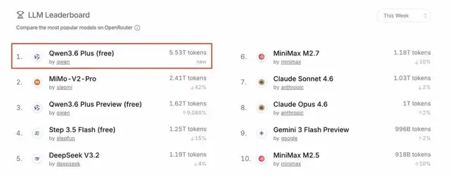 根据OpenRouter平台2026年4月第一周的最新统计数据显示,中国AI大模型周调用量高达12.96万亿Token,连续五周超越美国。