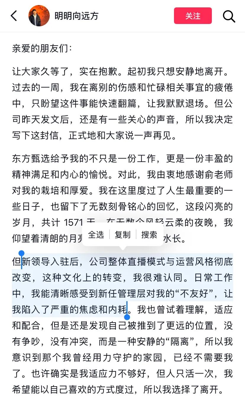 而曾得到新东方助学金资助、后加入东方甄选担任主播的林林,同样表达了类似的观点:2026年以来,工作环境和氛围发生了一些变化,过度焦虑开始伴随自己,“医生叮嘱,创伤的恢复需要远离创伤制造者”。