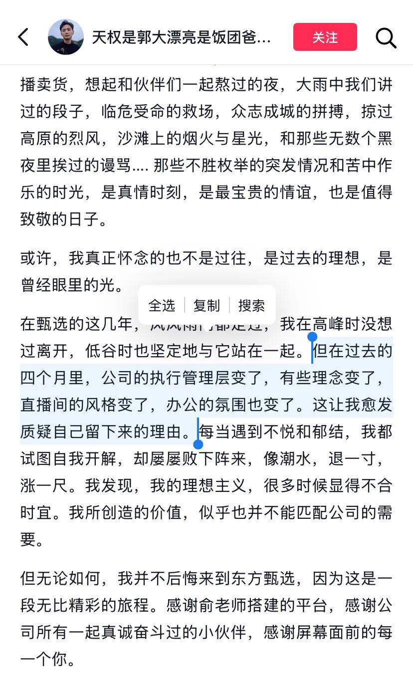 天权也表示,“在甄选的这几年,风风雨雨都走过,我在高峰时没想过离开,低谷时也坚定地与它站在一起”。但在过去的四个月里,公司的执行管理层、理念、直播间风格、办公氛围都变了,这让他愈发质疑自己留下来的理由。