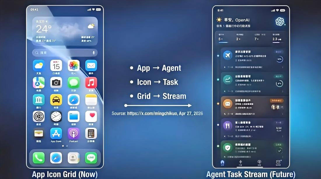 这套逻辑,与郭明錤概念图中描述的OpenAI手机设计高度一致——将传统手机界面从满屏App图标转变为任务清单交互。