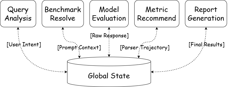 One-Eval引入了基于全局状态(Global State)的数据总线架构。评测的完整生命周期都被记录下来,一旦报错,断点清晰可见,全链路可追溯。