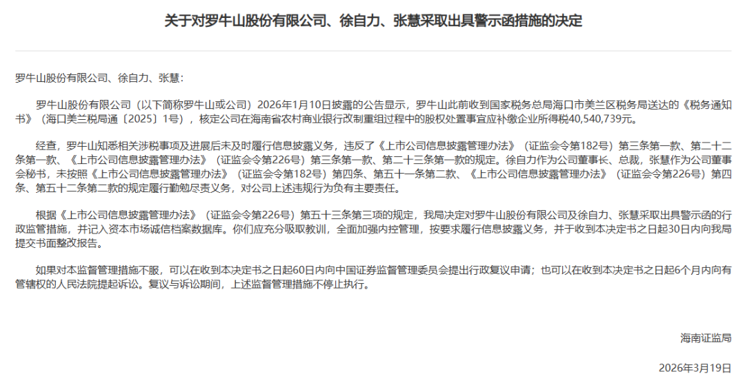 因税款一直未补缴,罗牛山又于3月20日收到了海南证监局的警示函,对其董事长徐自力、董事会秘书张慧采取出具警示函的行政处罚。