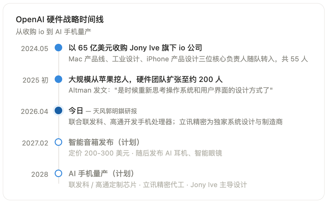 2027年2月出货智能音箱(定价200-300美元),随后是AI耳机、智能眼镜,手机是最后一环。Jony Ive在收购声明里写道:“过去三十年学到的一切,都是为了这一刻。”