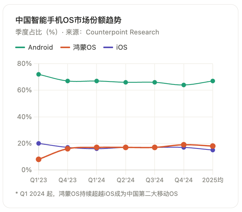 截至2025年底,鸿蒙OS在中国智能手机市场的份额已接近17%,且仍在增长。如果鸿蒙的AI Agent能力真的形成领先,中国市场的AI手机定义权,可能根本轮不到豆包来争。