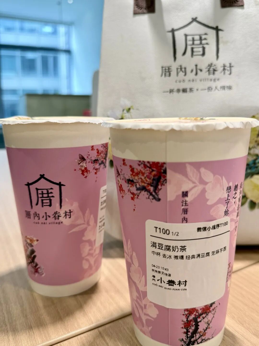 于我而言,厝内小眷村同样是青春记忆里的台式奶茶“白月光”。去年,我也曾下单紫金港店的同款涓豆腐,不额外加糖。对比之下,这次点的微糖口感反而更加清爽。