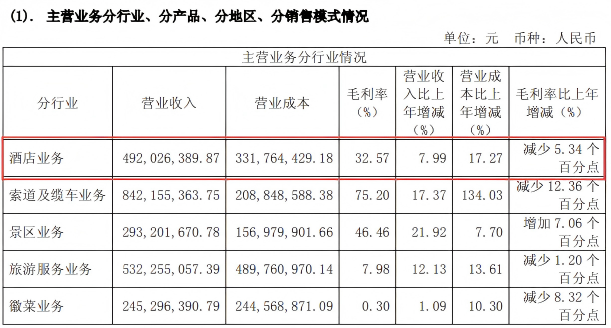 其索道及缆车业务、酒店业务收入在总营收中占比分别为37.2%、23.6%,差距仍在。