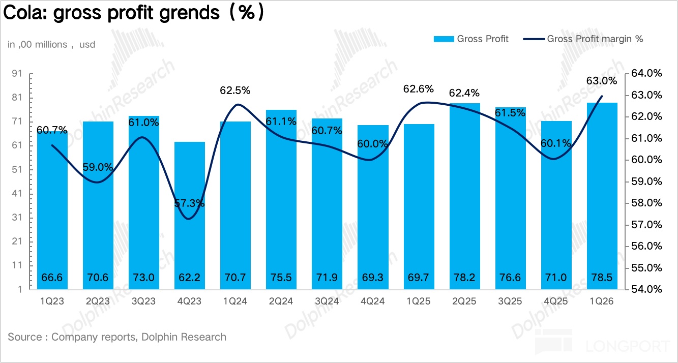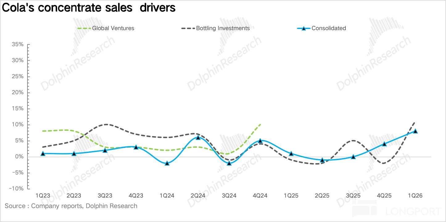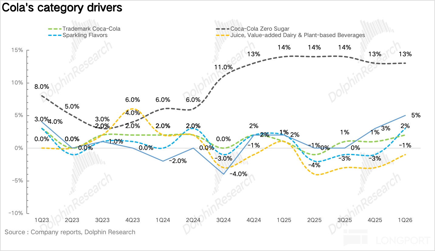 量:1Q26 浓缩液销量同比增长 8%。具体拆分来看,对于碳酸饮料品类,在全球减糖风潮下,零糖依然保持了双位数(13%)的快速增长。