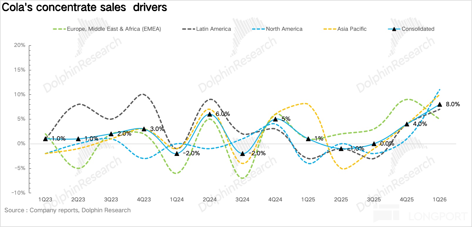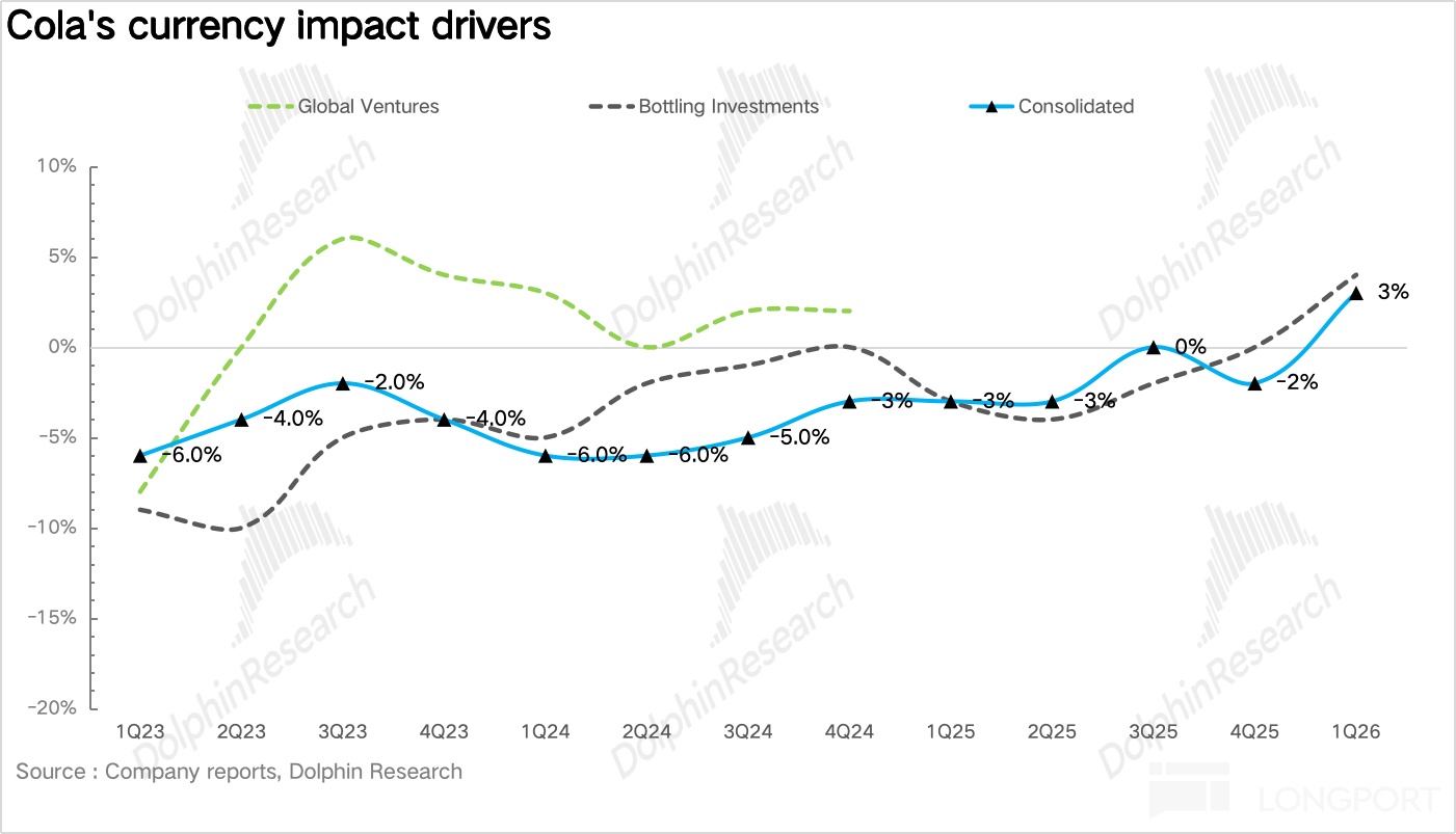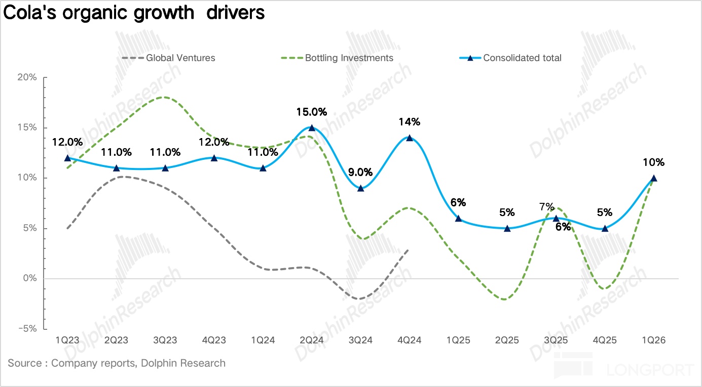 量:1Q26 浓缩液销量同比增长 8%。具体拆分来看,对于碳酸饮料品类,在全球减糖风潮下,零糖依然保持了双位数(13%)的快速增长。