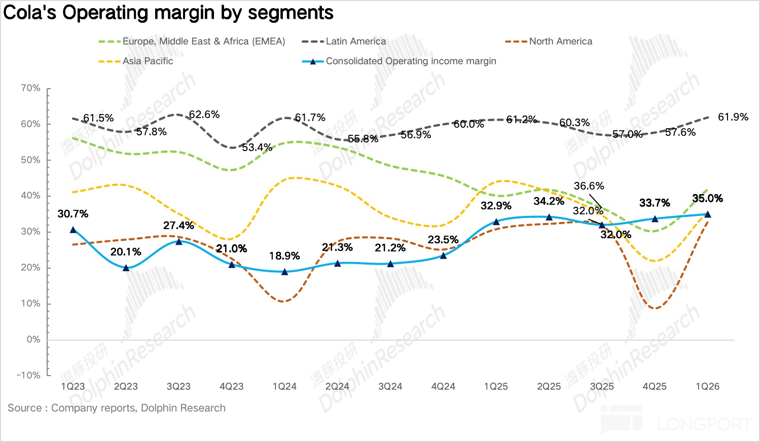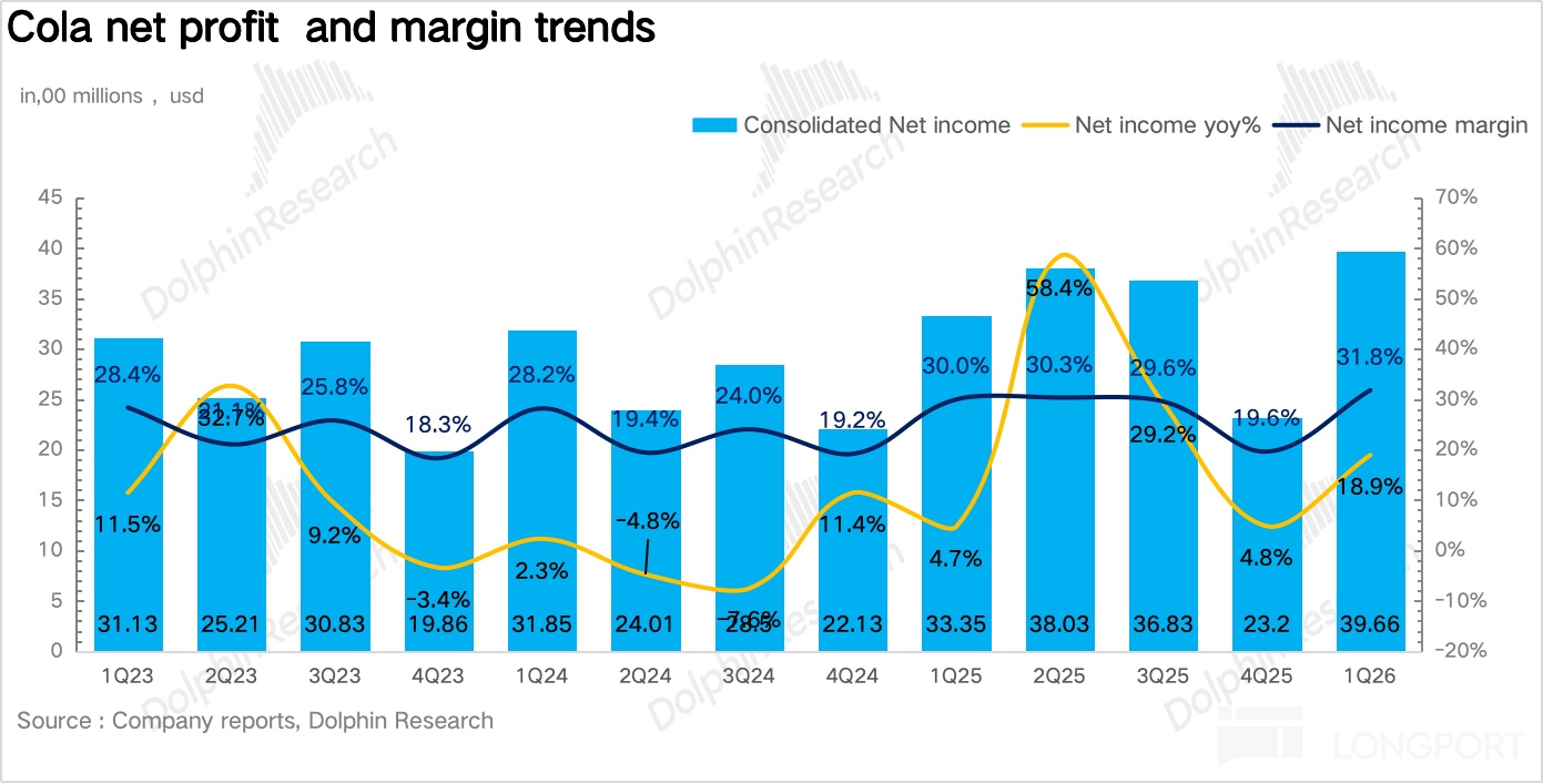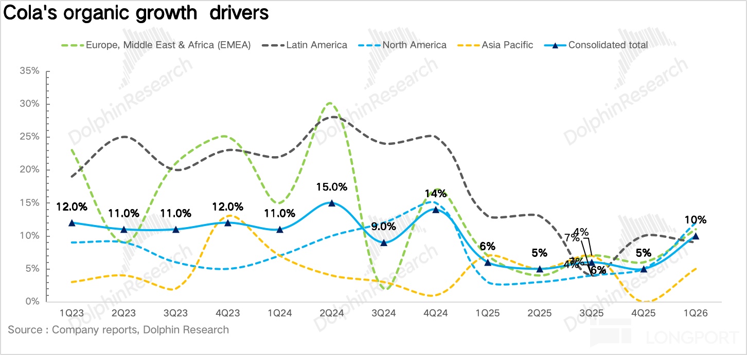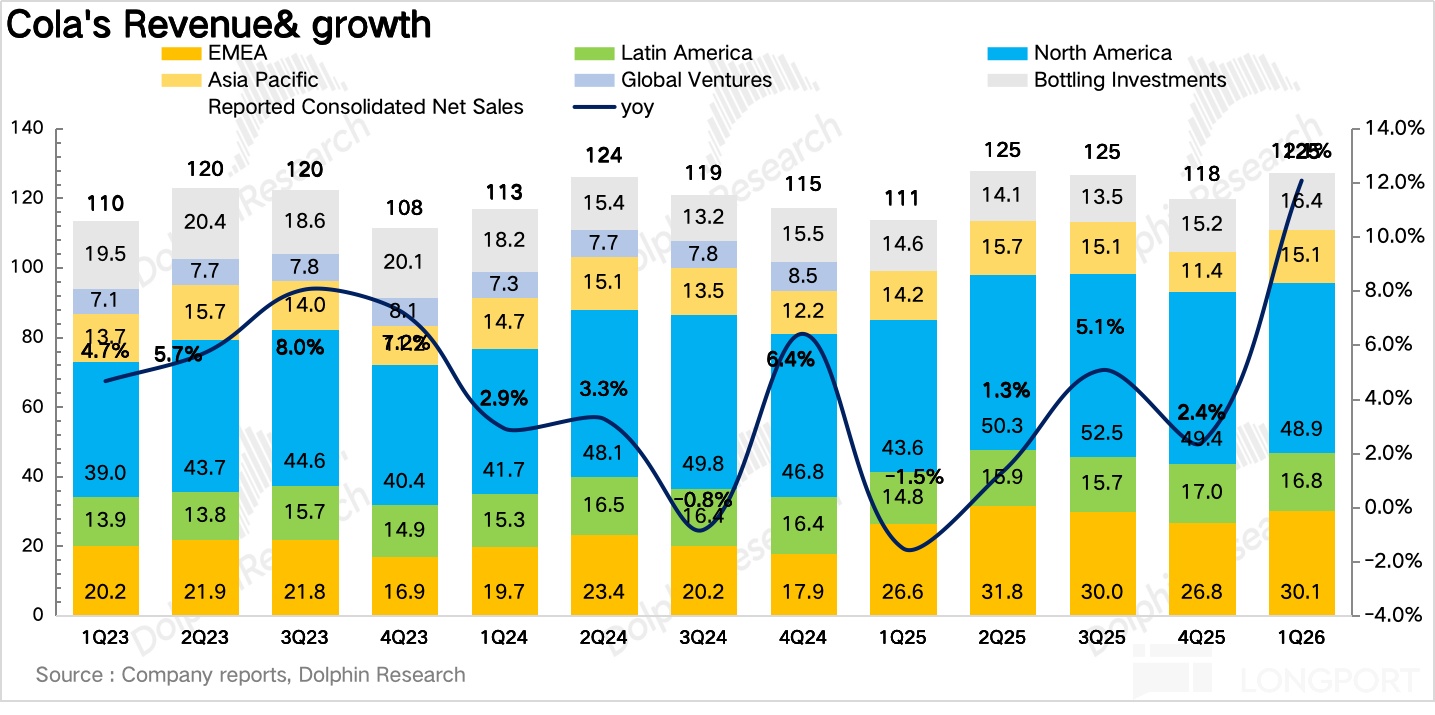 北美地区:营收 48.9 亿美元,同比增长 12%,一方面,去年同期 ICE 相关谣言冲击了西班牙裔消费者情绪和购买行为,导致基数偏低,这一拖累在今年一季度完全消退,形成了有利的同比基数。另一方面,作为可口可乐 2019 年收购的超滤牛奶品牌,fairlife 长期处于供不应求状态。2026 年 30% 的新增产能正在逐步释放,叠加年初的提价动作,对北美收入增长形成了显著拉动