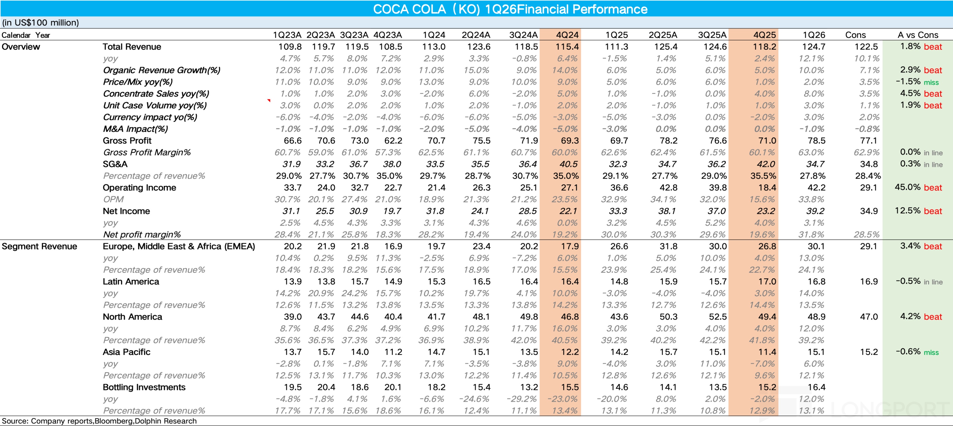 1、营收增长强劲,实现 “开门红”。1Q26 可口可乐实现表观营收 124.7 亿美元,同比增长 12%,其中内生营收同比大增 10%,量价拆分看,浓缩液销量同比增长 8%,价格/组合增长 2%。需要注意的是,一季度比去年同期多出 6 个交易日,对浓缩液销量有约 5 个百分点的提振,但即便剔除日历效应,底层动销依然极为强劲。