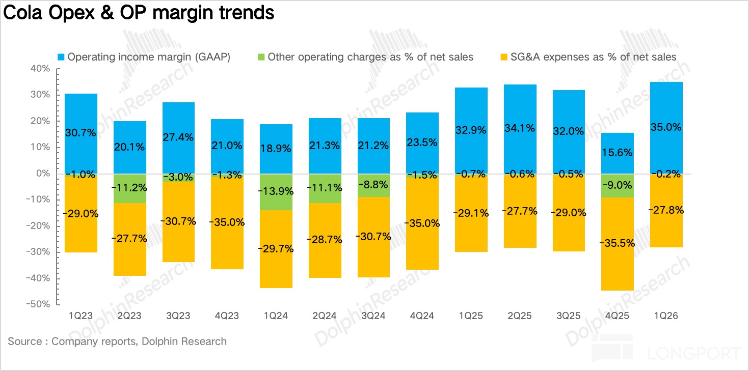 从实际数据来看也是如此——26Q1 可口可乐的核心经营利润率达到 34%,而同期百事可乐(PEP)的核心经营利润率仅为 15.7%,二者的盈利能力差距再次拉大。这背后反映的正是可口可乐极致轻资产模式 vs 百事可乐重资产全产业链整合模式,在成本波动与宏观逆风环境下的本质差异