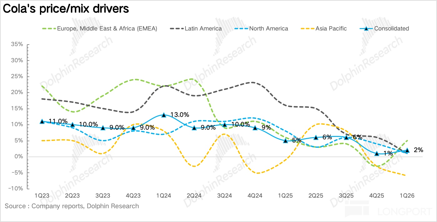 但从一季度的实际结果来看,可口可乐凭借强大的渠道掌控力和价格传导能力,平稳消化了这一政策冲击。装瓶商合作伙伴 Arca Continental 和 Coca-Cola FEMSA 均已在现代渠道完成了提价动作。