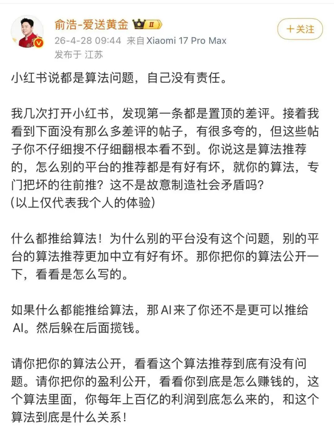 4月28日,俞浩发文将批评重点指向小红书算法。“我几次打开小红书,发现第一条都是置顶的差评……你说这是算法推荐的,怎么别的平台的推荐都是有好有坏,就你的算法,专门把坏的往前推?”