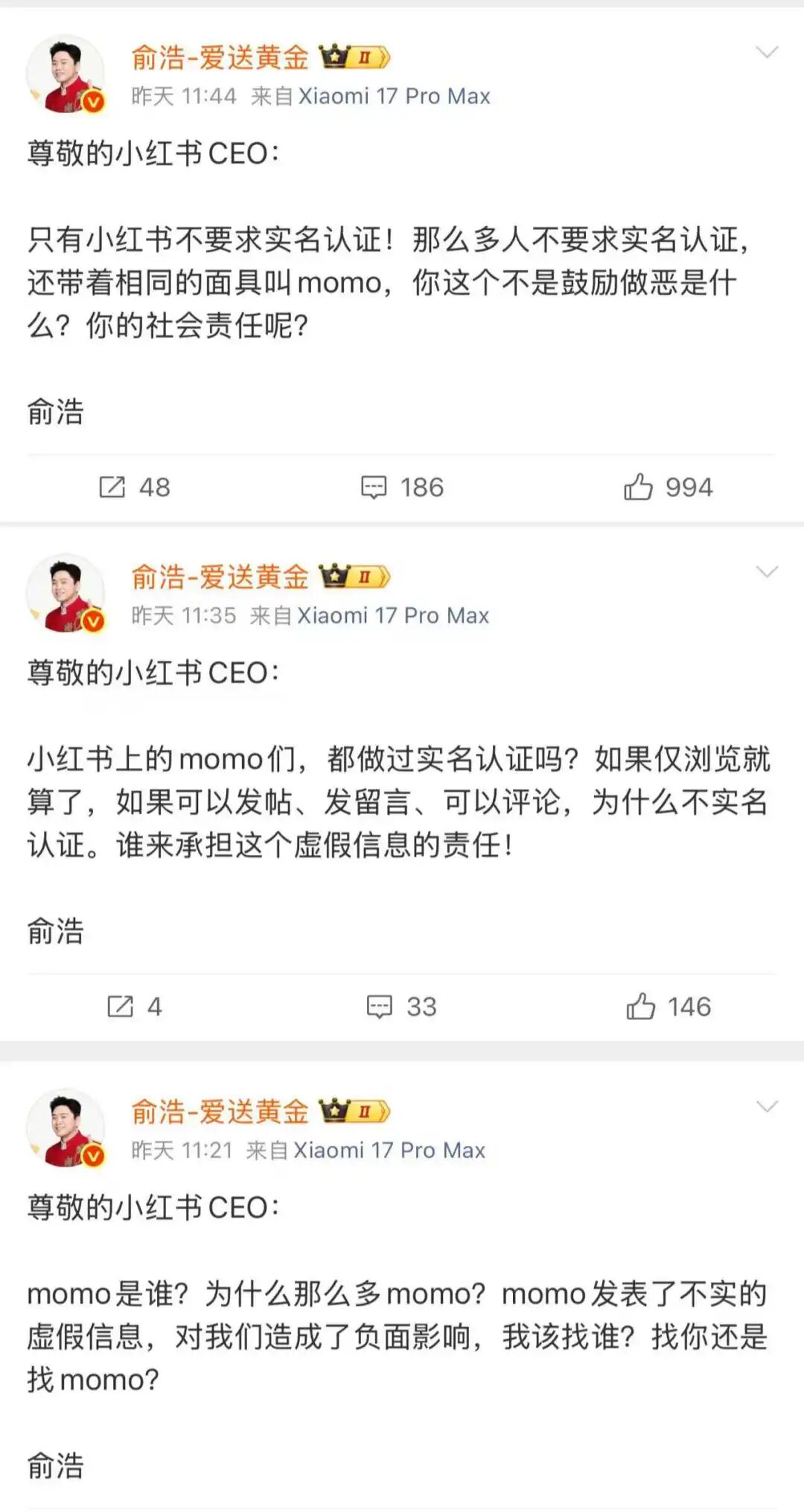 4月29日,俞浩连发三条微博喊话小红书CEO,将议题转向平台责任。