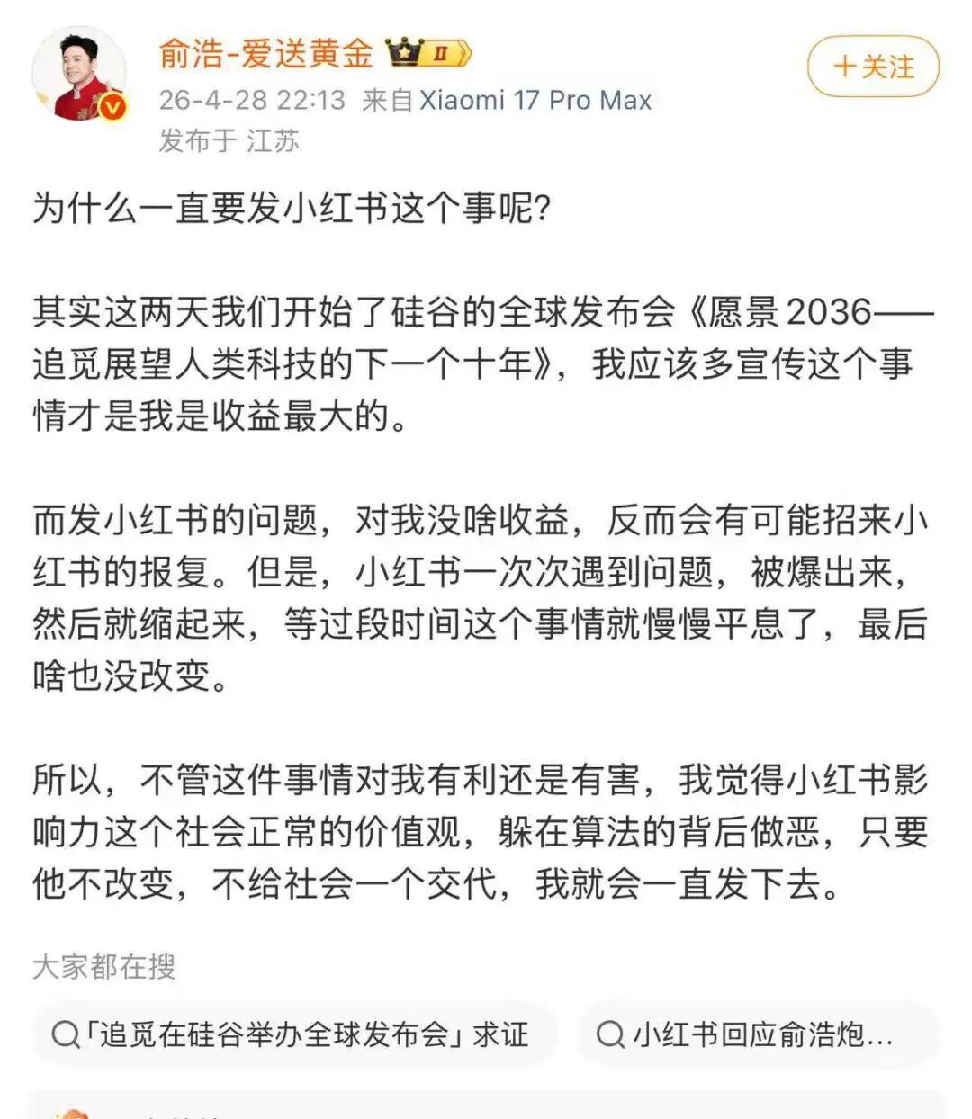 一个百亿级科技公司的创始人,把矛头对准了月活3.5亿的小红书。