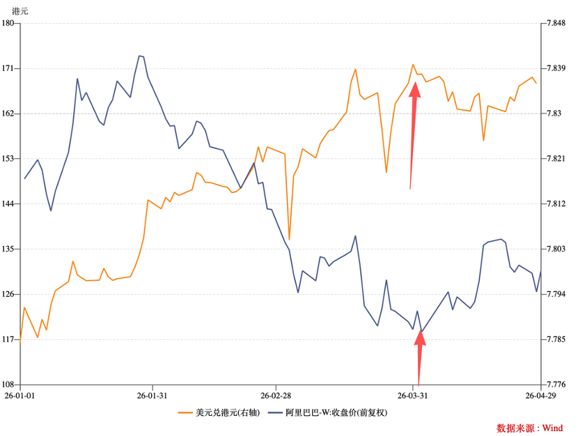 在上图中我们也可以看到,2026年2月之前这轮资金流出基本告一段落,港元逐渐企稳,也就是在此时阿里股价达到了近期的高点。但伊朗冲突之后,上述机制又开始继续运转,3月末之前资金流出速度明显加快。
