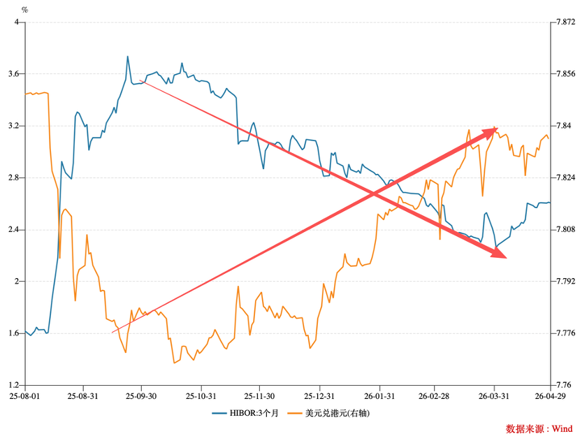 2025年Q3以来,香港金融市场经历了一轮非常严峻的资金流出周期,其表现就是港元贬值(资金流出要将港币换回美元),HIBOR下降(在汇市被置换出来的港元增加,银行间拆借利率下行)。