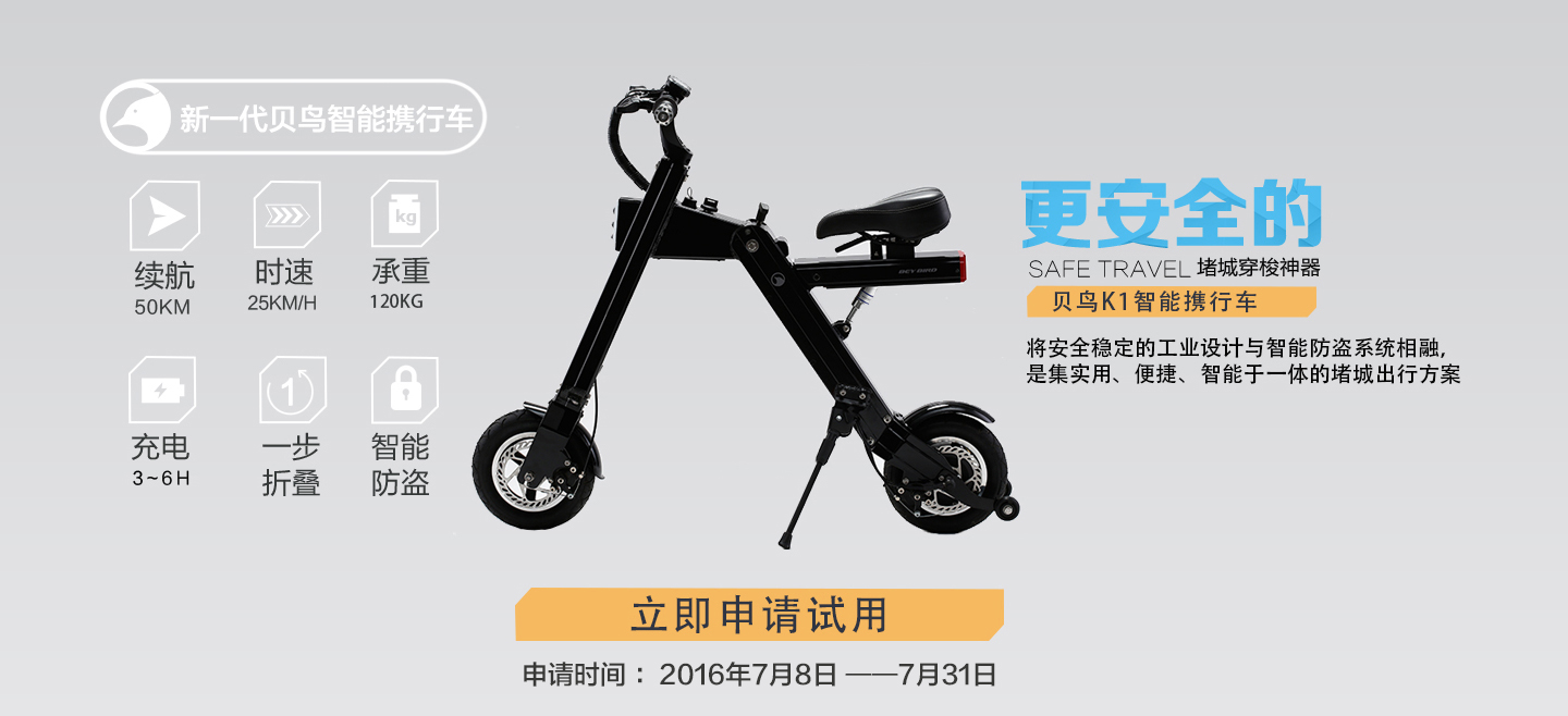 为了让更多的人能够近距离接触贝鸟K1智能便捷车,让更多的人拥有这一款堵城穿梭神器,钛媒体联手贝鸟K1智能便捷车推出免费试用福利。