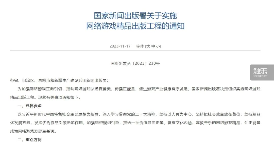 在触乐去年的预测中,新的游戏扶持计划是非常重要的部分,因为这是政策方面比较直接的风向标。好消息是,2023年9月,国家新闻出版署宣布实施“网络游戏精品出版工程”,并在11月正式下发通知。报名并成功入选的作品会获得扶持。此前,较为知名的扶持政策有版署2004年开展的“中国民族网络游戏出版工程”与广电总局2016年开展的“原创游戏精品出版工程”,它们为上百部国产游戏提供了支持。