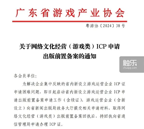 如3月5日,广东省游戏协会发布了《关于网络文化经营(游戏类)ICP申请出版前置备案的通知》。通知表示,针对省内新设立游戏运营企业ICP证申请困难的问题,“即日起启动省内新设立游戏运营企业ICP申请出版前置备案申请工作(含续证),游戏运营企业(含新设立)向省新闻出版局政务大厅提交相关申请材料,取得网络文化经营(游戏类)出版前置备案回执后,持回执向省通信管理局申请办理ICP证。”