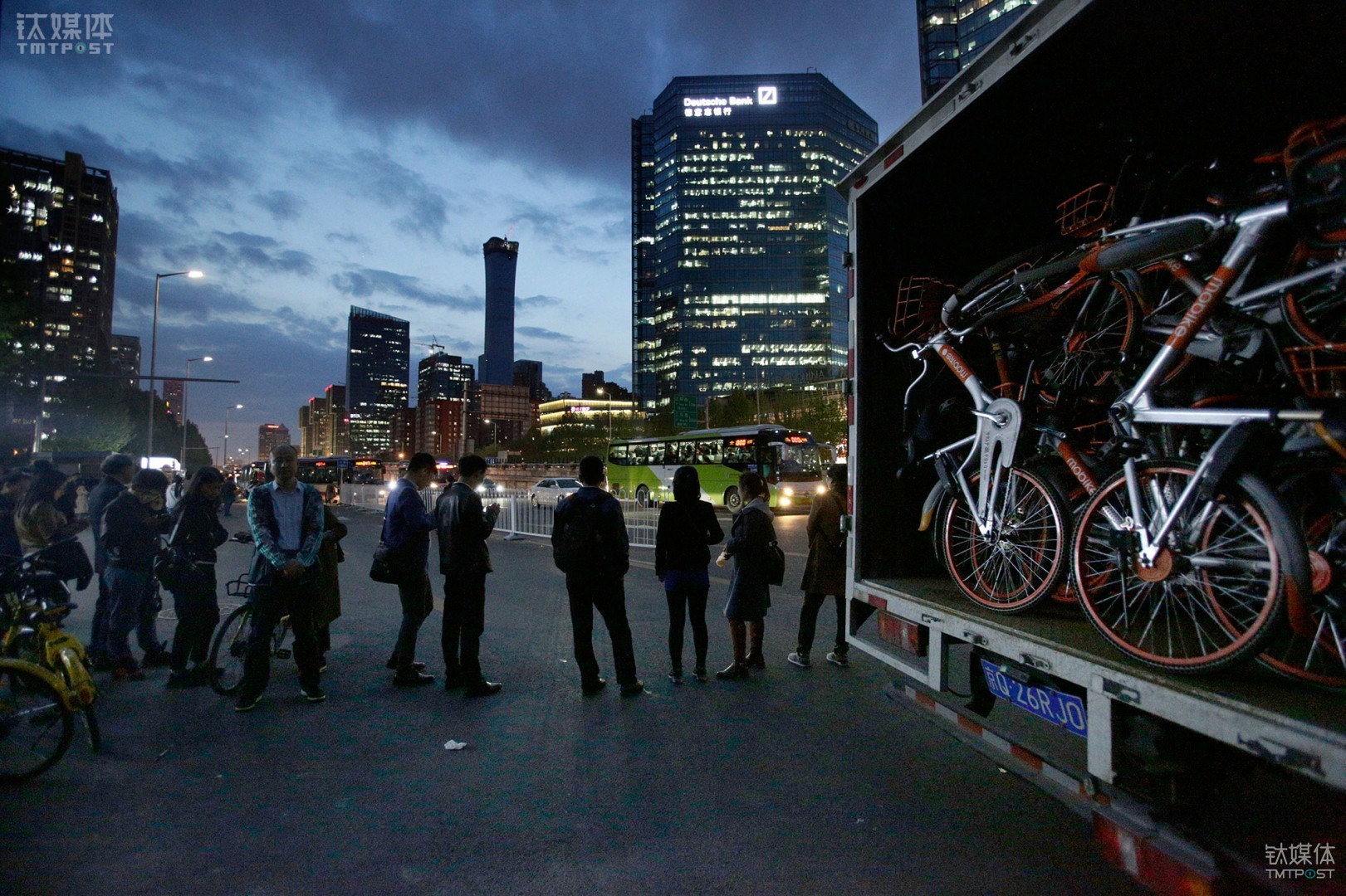 There are a group of workers who dispatch shared bikes in the simplest way amid the b...