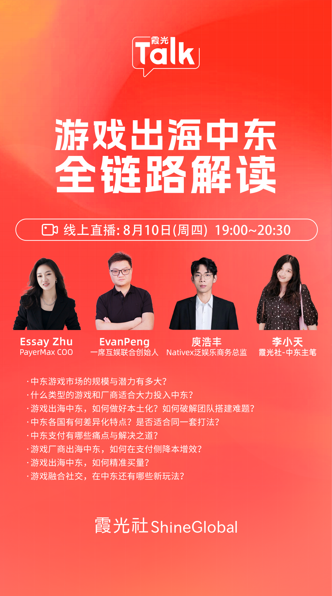 由霞光智库出品的《中东地区游戏趋势报告》将在本次直播现场发布,敬请期待