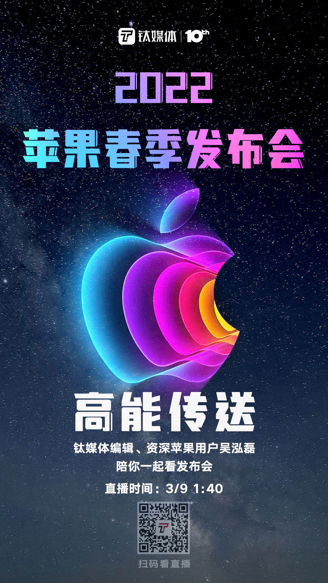 此次发布会的主题为《高能传送》(Peek Performance),其中多彩的苹果logo图标可能在暗示某款新品将会有多种机身颜色。